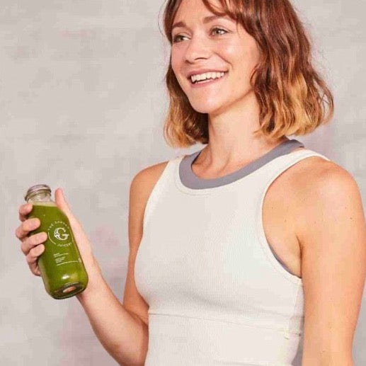 Apple contains pectin, a soluble fibre, which binds to toxins and eliminates them through its gel-like consistency in the intestine. We add nutrient rich leafy-greens and herbs such as coriander, which is a rich source of calcium and the compounds within are powerful chelators, which means it binds to toxic heavy metals present in our system. We use organic liquid chlorophyll to increase the green power of this juice.
